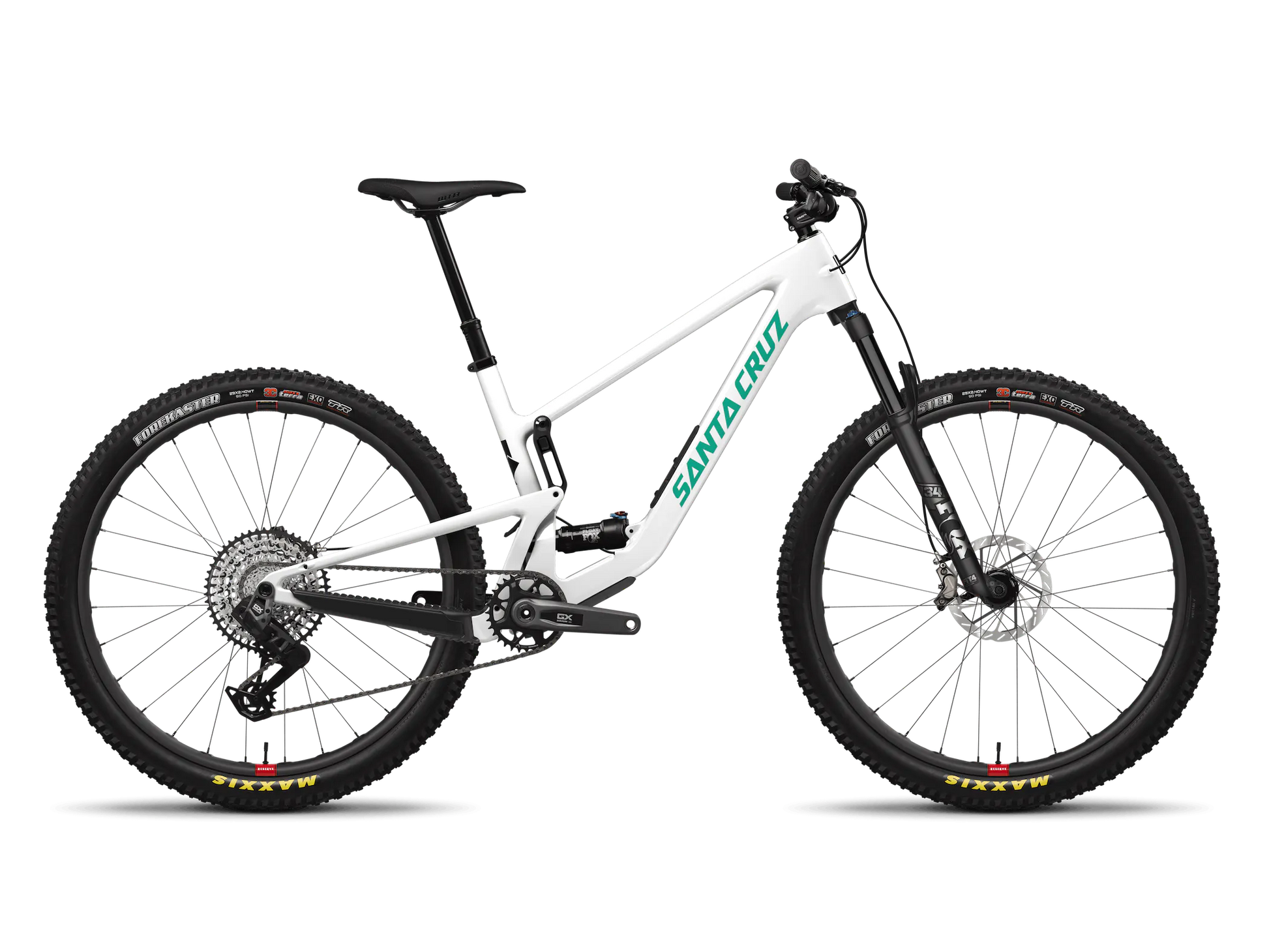 GX AXS RSVColour Gloss White or Gloss MelonFrame Carbon CTravel 120mmWheel Size 29Rear Shock FOX Float Performance Elite, 190x45Fork FOX 34 Float Performance Elite, 130mm -or- Rockshox Pike Select+Rear Derailleur SRAM GX Eagle AXS T-Type, 12spdRight Shifter SRAM AXS Pod BridgeCassette SRAM GX Eagle T-Type, 10-52tChain SRAM GX Eagle T-Type, Flattop, 12spdBottom Bracket SRAM DUB 73mm MTB Wide BBHeadset Cane Creek 40 IS Integrated HeadsetRear Tire Maxxis Forekaster 29"x2.4"WT, 3C, MaxxTerra, EXOFront Tire Maxxis Forekaster 29"x2.4"WT, 3C, MaxxTerra, EXOFront Hub DT Swiss 370, 15x110, 6-Bolt, 28hFront Rim Reserve 30|SL 29"Rear Hub DT Swis 370, 12x148, XD, 6-Bolt, 36t, 28hRear Rim Reserve 30|SL 29"Front Rotor SRAM HS2 180mmRear Rotor SRAM HS2 180mmBrakes SRAM Level Bronze Stealth 4-PistonCrankset SRAM GX Eagle DUB T-Type Crankset, 32tHandlebars Santa Cruz CarbonStem Burgtec Enduro MK3, 42mmSaddle WTB Silverado Medium, CroMoSeatpost OneUp V2 Dropper Post, 31.6 -or- Reverb Stealth -or- Fox TransferGrips Santa Cruz Bicycles House GripsBattery Charger SRAM eTap Powerpack 1 Battery